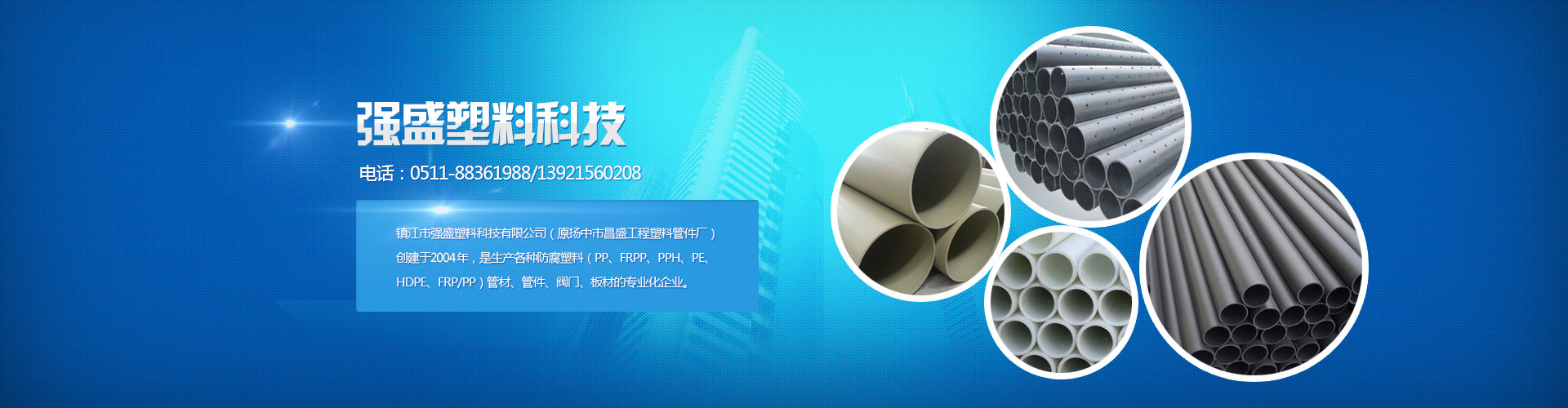 鎮(zhèn)江市強盛塑料科技有限公司(原揚中市昌盛工程塑料管件廠)創(chuàng)建于2004年,是生產(chǎn)各種防腐塑料(PP、FRPP、PPH、PE、HDPE、FRP/PP)管材、管件、閥門、板材的專業(yè)化企業(yè)。公司擁有各類先進(jìn)生產(chǎn)設(shè)備,固定資產(chǎn)約3800萬元,可生產(chǎn)管材、管件口徑為Φ15-Φ1200mm,產(chǎn)品規(guī)格齊全。目前產(chǎn)品廣泛適用于醫(yī)藥、食品、冶金、造紙、電力、礦山、城市污水處理、垃圾填埋、輕工紡織等領(lǐng)域,暢銷全國各省市自治區(qū),遠(yuǎn)銷二十多個國家及地區(qū)。
